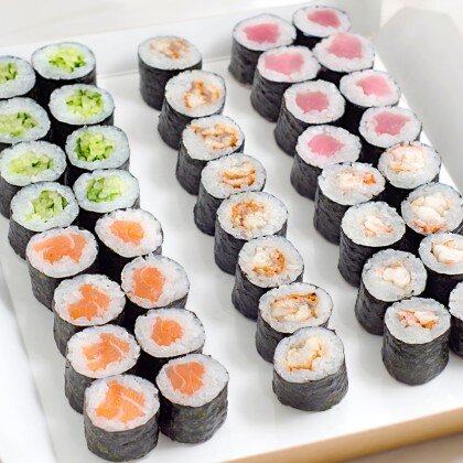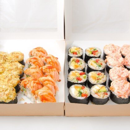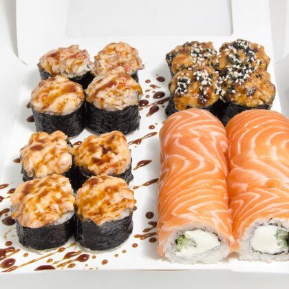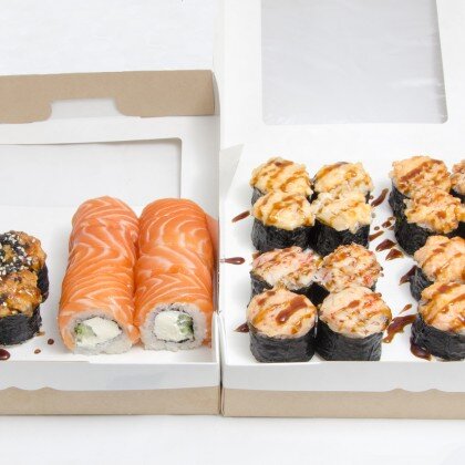 Запечённый ролл с угрём 4 кусочка. Запечённый ролл с лососем 4 кусочка. Запечённый ролл с крабом 4 кусочка. (Угорь, лосось, крабовое мясо имитация, огурец, сливочный сыр, икра масаго, нори, сырный соус, рис, соус унаги, кунжут).