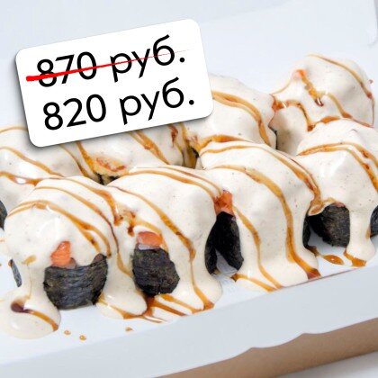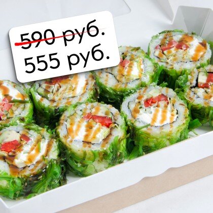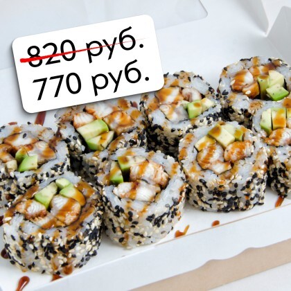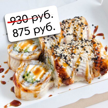 Угорь, такуан, сыр сливочный, соус том-ям, соус унаги, рис, нори, лук зеленый, кунжут