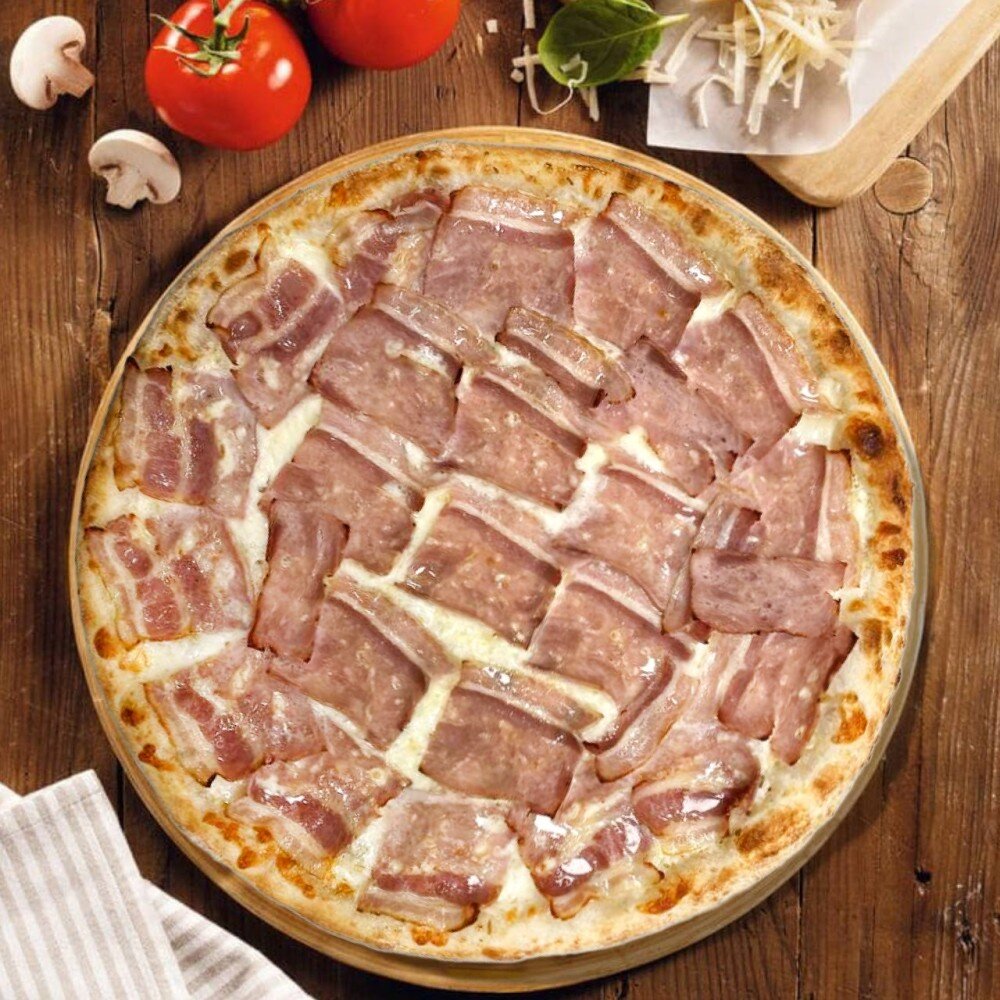 Сливочный соус, бекон, яичный желток (по желанию), сыр моцарелла, сыр пармезан