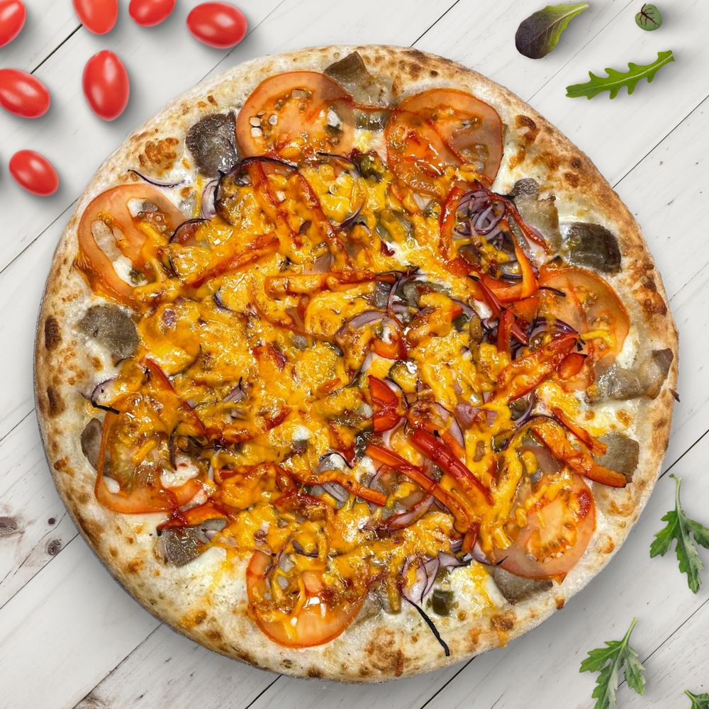 Соус сливочный, сыр чеддер, сыр моцарелла, буженина собственного приготовления, перец болгарский, перец халапеньо, томаты, соус свит-чили, соус шрирачи, лук красный