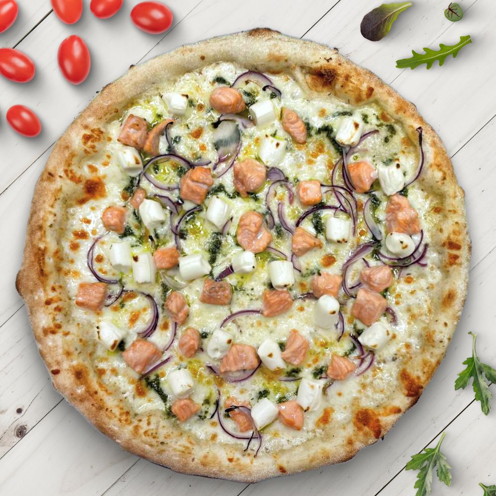 Пицца с лососем, сливочным сыром и песто