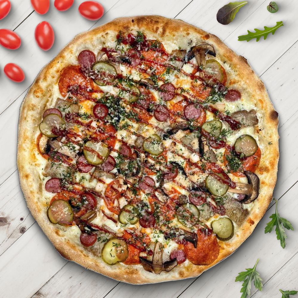 Сочная, ароматная пицца на сливочном соусе с бужениной, куриным филе, пепперони и охотничьими колбасками. Вкус мясных ингредиентов дополняют грибы, маринованные огурчики, соус барбекю и щепотка укропа с чесноком.