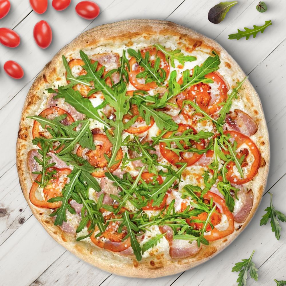 Переосмысленный рецепт традиционной пиццы Карбонара, приготовленной на сливочном соусе, с добавлением свежих томатов, рукколы и орегано.