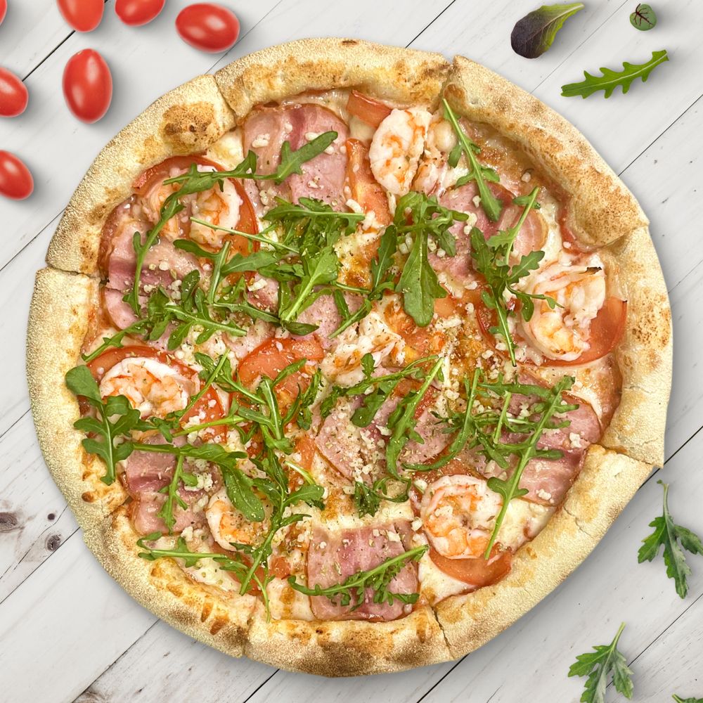 Томатный соус, сыр моцарелла, креветки, бекон, руккола, томаты свежие, сыр пармезан, соус песто, орегано