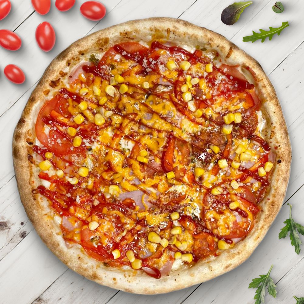 Острая, сочная пицца с пепперони, курой и ветчиной. Сочетание шрирачи, халапеньо и соуса свит-чили создает интересную последовательность вкусовых ощущений - остро-сладко-остро, которая оттеняется чеддером, томатами, болгарским перцем и сладкой кукурузой. Ингредиенты: филе куриной грудки, колбаски пепперони, ветчина из индейки, томаты свежие, соус свит-чили, соус шрирачи, перец болгарский, перец халапеньо, кетчуп томатный классический, кукуруза консервированная сладкая, сыр моцарелла, сыр чеддер, сыр пармезан.