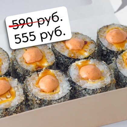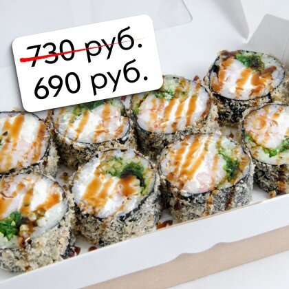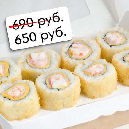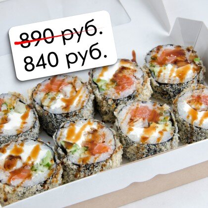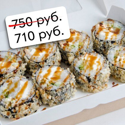 Ингредиенты: филе лосося, сыр сливочный, огурцы, икра масаго, нори, мука для кляра, сухари темпурные, рис для суши, соус спайси, соус унаги, соус шрирачи.