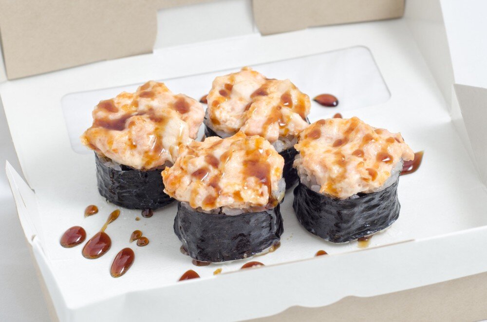 Лосось, сливочный сыр, огурец, сырный соус, нори, рис, соус унаги