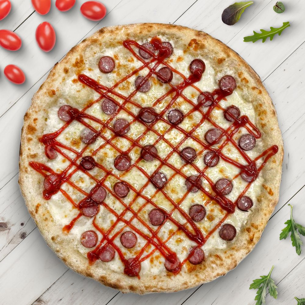 Сочная, не острая пицца с охотничьими колбасками и томатным кетчупом. Хороший вариант, в том числе, для детей, которые хотят просто пиццу с колбасками :)