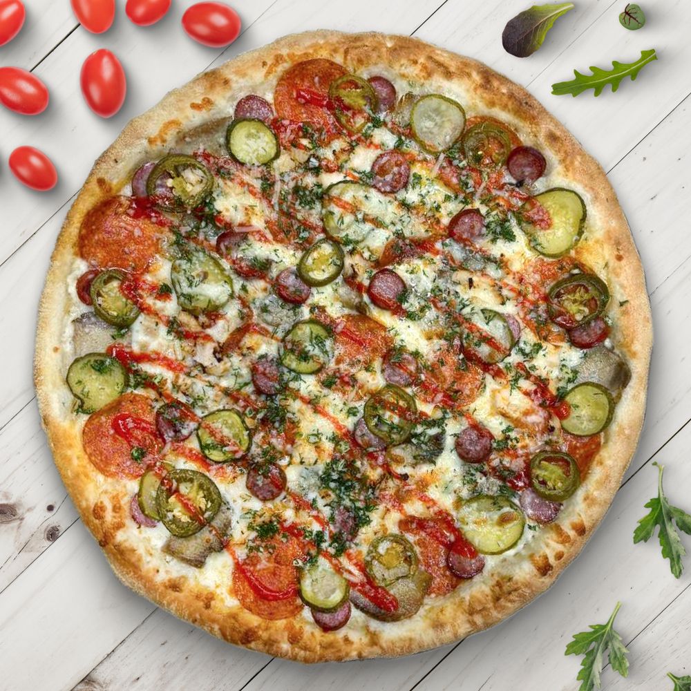 Филе куриное, буженина, колбаски пепперони, огурчики маринованные, колбаски охотничьи, укроп, чеснок, моцарелла, пармезан, халапеньо, соус сливочный, соус шрирачи
