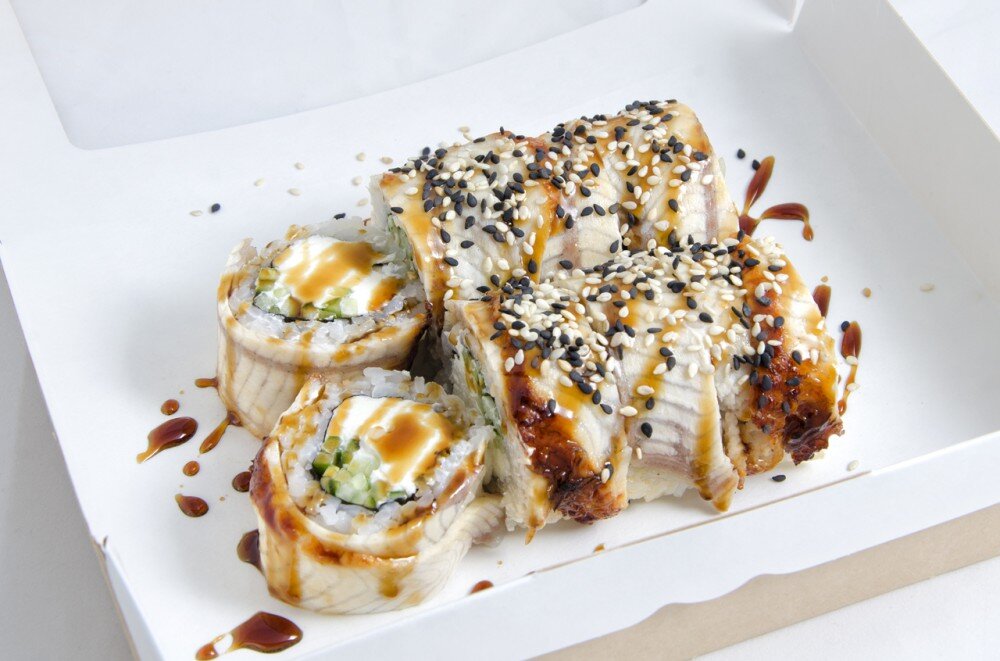 Угорь, сыр сливочный, огурец, нори, рис, соус унаги, кунжут