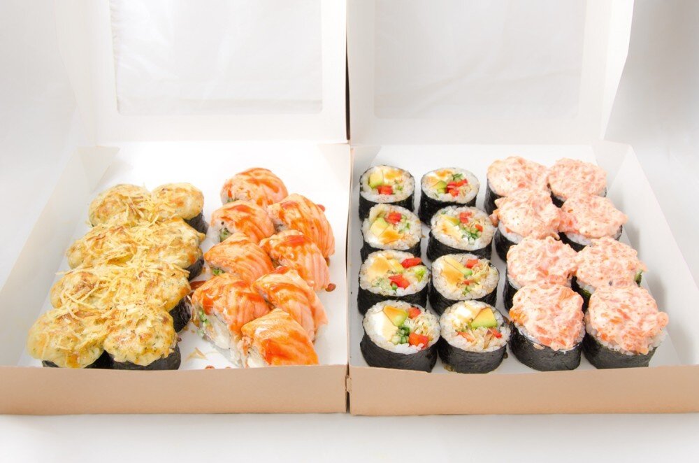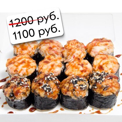 Выгода 25%. Запеченный ролл с лососем, креветкой и острым крабом. Запеченный ролл с курицей. Овощной ролл-лайт. Острый ролл с креветкой, лососем и омлетом. (Лосось, Креветка, Крабовое мясо имитация, Курица, Яйца, темпурные сухари, рис, нори, Сырный соус, Соус спайси, Соус унаги, Соус Кимчи, укроп, сладкий перец, салат айсберг, авокадо, огурцы, сливочный сыр, зеленый лук, картофель).