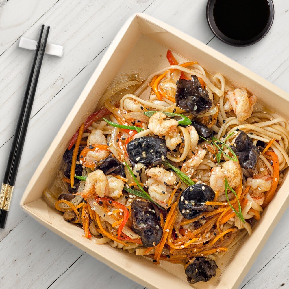 Подается с комплектом палочек. Ингредиенты: лапша удон, креветки, перец болгарский, лук репчатый, чеснок, морковь, грибы моэр, масло растительное, кунжут, соус терияки, лук зеленый.