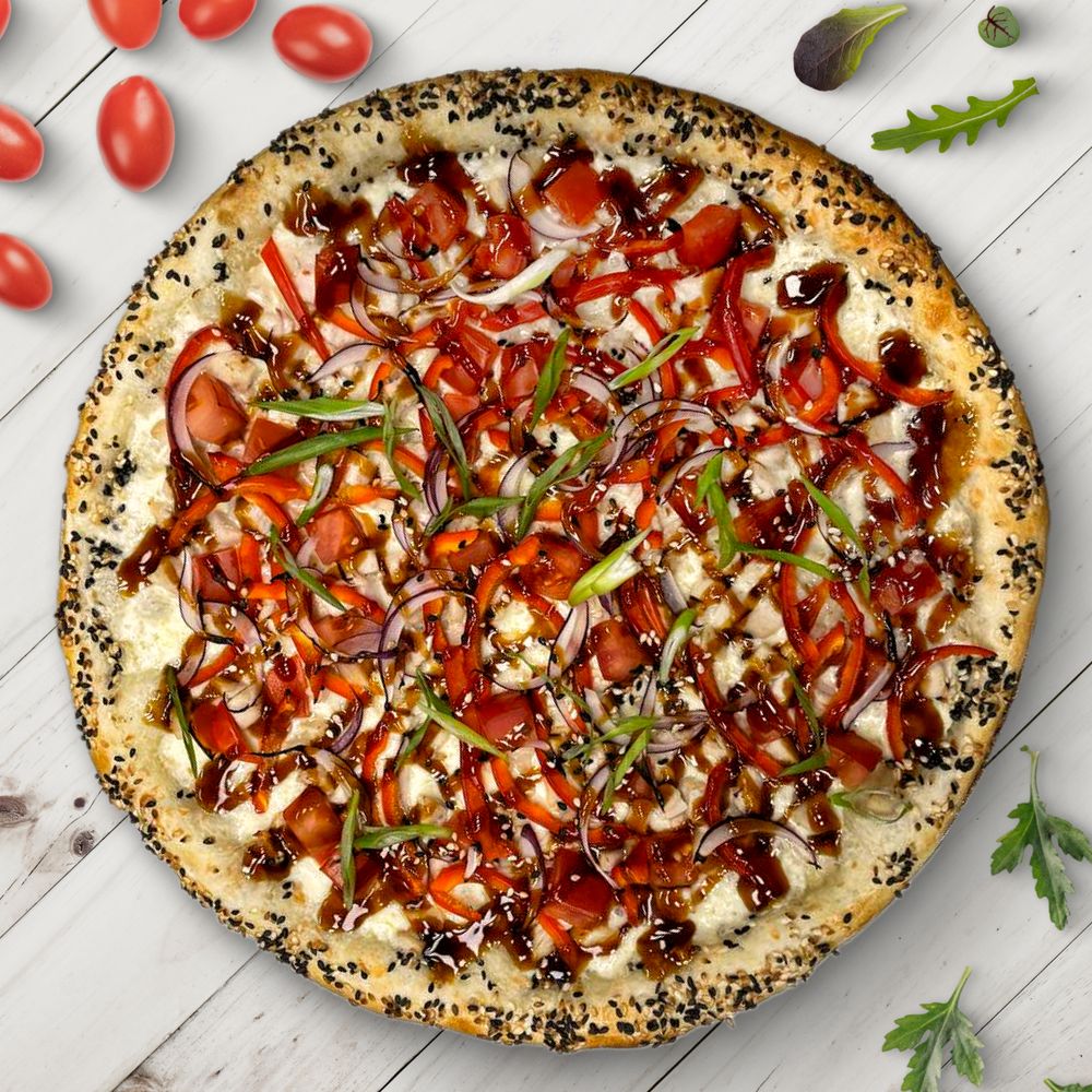 Соус сливочный, сыр моцарелла, филе куриной грудки, перец болгарский, помидоры, лук красный, лук зеленый, соус терияки, кунжут.