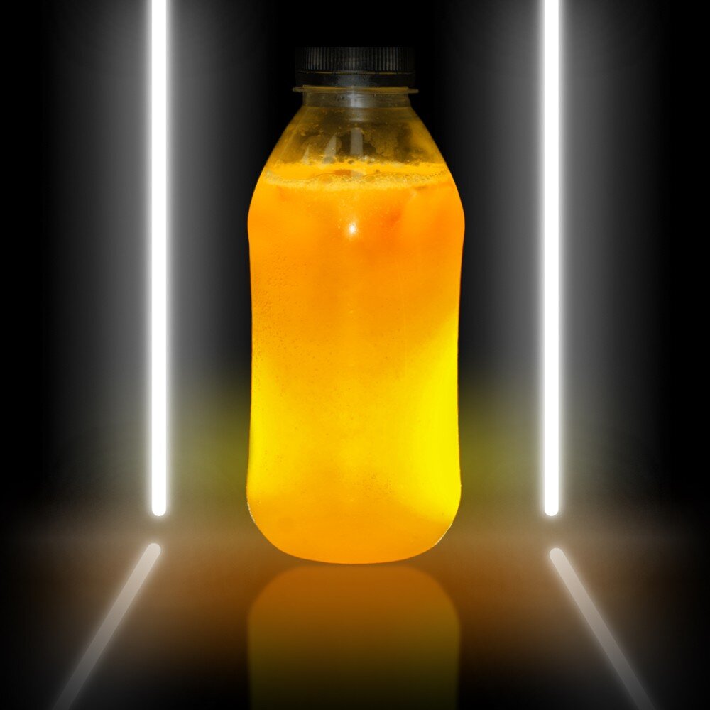 Подается с трубочкой в индивидуальной упаковке. Ингредиенты: пюре из манго натуральное, кубики манго, сироп из манго, вода газированная.