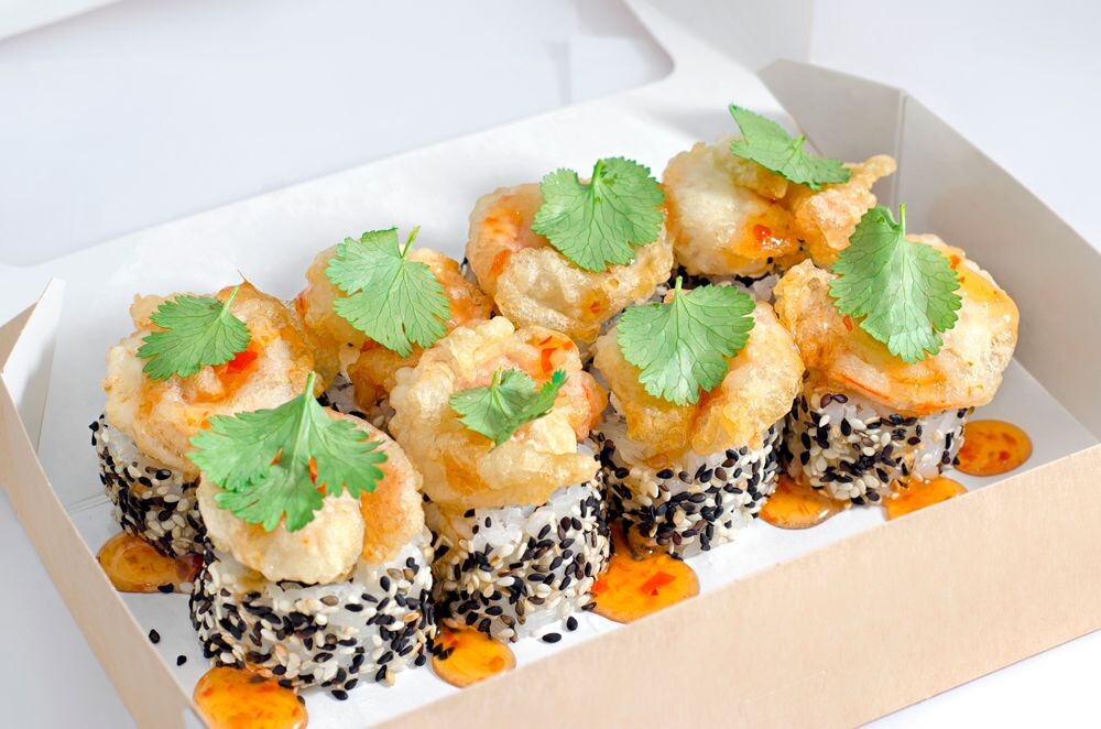 Креветки в темпуре, нори, рис, сыр сливочный, огурцы, соус свит-чили, кунжут, кинза
