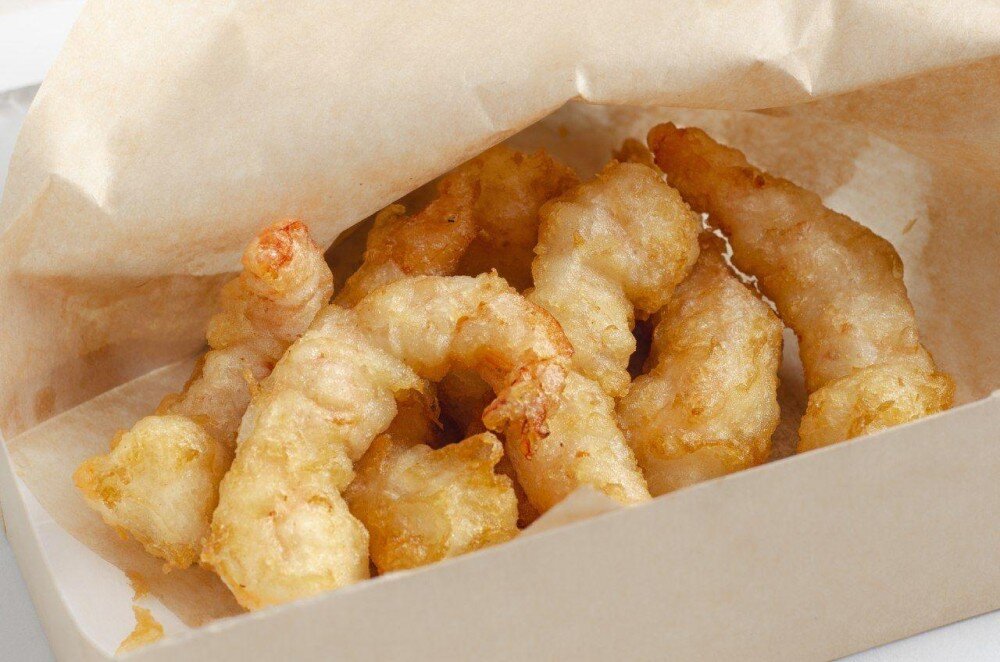 Креветки, кляр темпурный, соус на выбор: «сладкий чили» или «спайси» (7-8 шт на порцию)